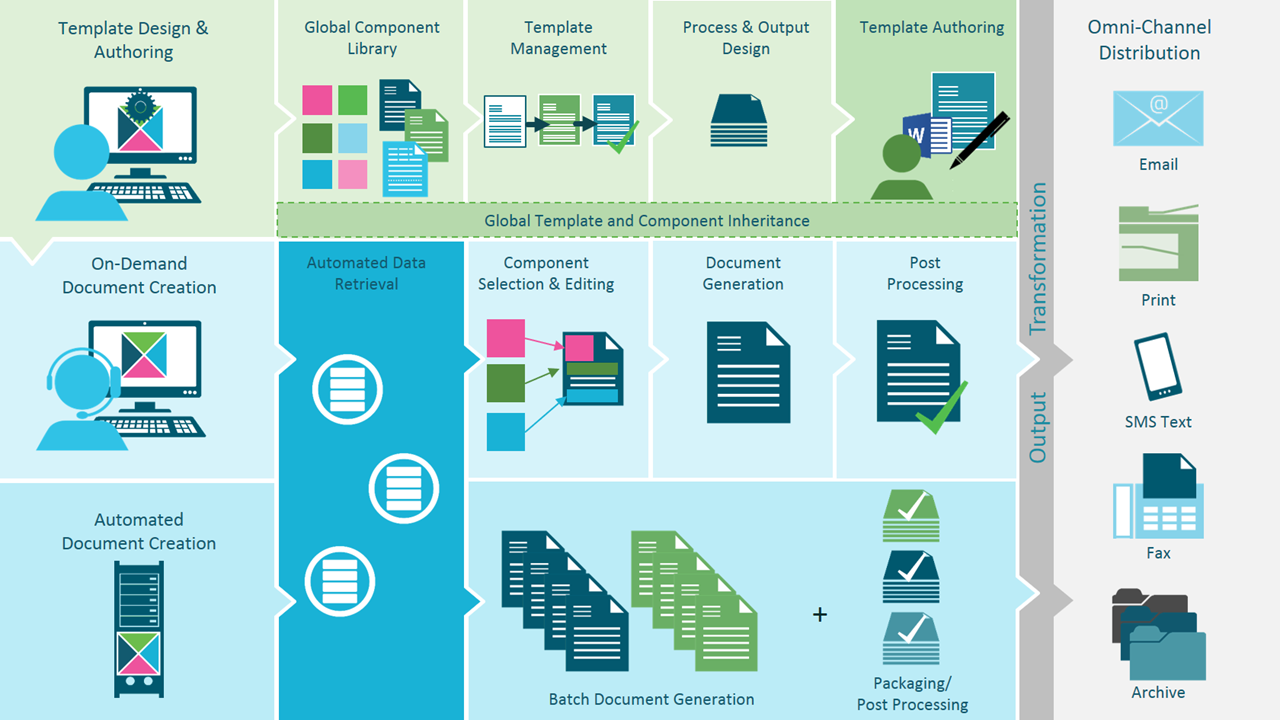 - Output: Document transformation and omni-channel distribution is configurable and flexible to allow for the desired outcome.