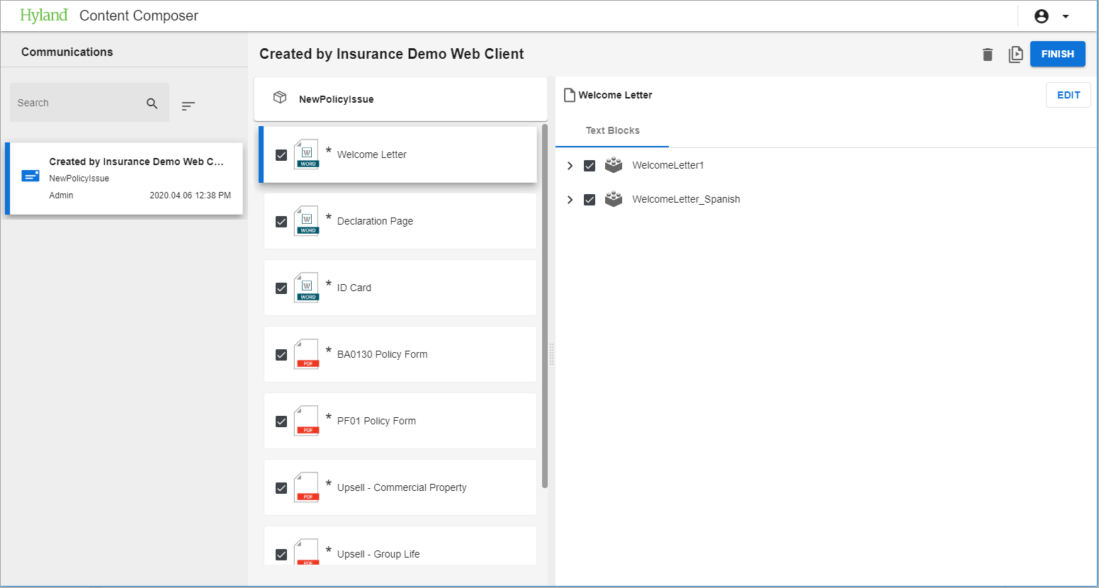 - Policyholder Communications (insurance): Empower business users and reduce departmental silos from new business and underwriting to customer service and claims by connecting with policyholders. An insurance representative can create a claim package and all associated documents. Content Composer populates the documents with available data, and the representative can optionally provide missing data, or personalize the claim package as needed. Once finalized, the claims package is archived and distributed to the customer.