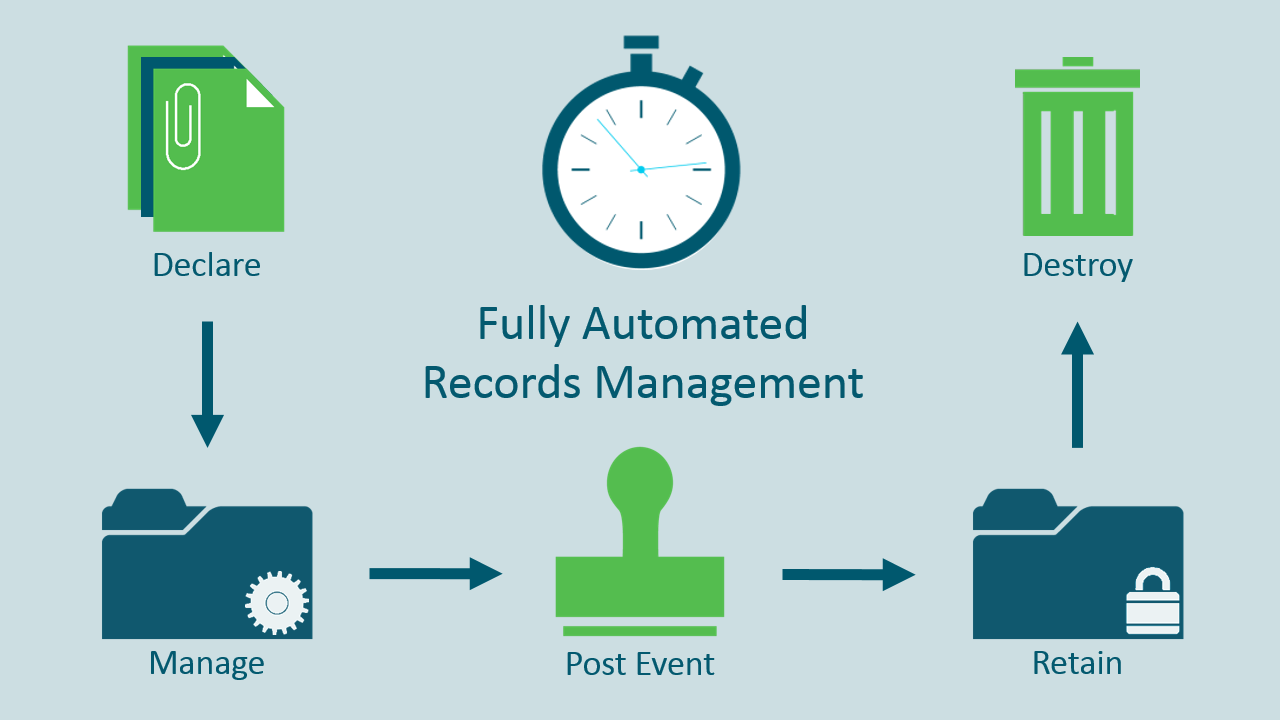 Documents, automatically declared as records (Declare), are auto-foldered into a managed folder that is in Open Status (Manage). An Event occurs (Post Event) on the record (folder) (e.g. employee separated, court case closed). When the event is posted, the record is moved to Closed Status, locking the record and preventing modification (Retain). This initiates the Retention Plan for the record. At the end of the retention period, the record, all documents and all metadata are destroyed (Destroy).
