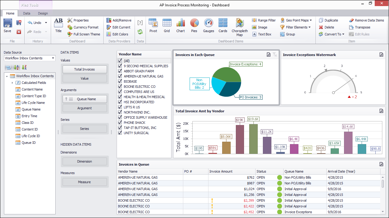 Reporting Dashboards aggregates valuable business information from OnBase as well as third-party data sources for complete visibility and analysis. Dashboards are point-and-click configured to utilize this raw data and display it in a variety of ways, including charts, graphs, maps and more. Users can view and interact with these dashboards, using filtering and drill-down functionality to create the exact view into the data they need to make critical decisions. From the Unity Client, data can even be directly related to OnBase content to provide greater context when making business decisions. Dashboards are also accessible from the Web Client and even any standard web browser by leveraging the Reporting Web Viewer.